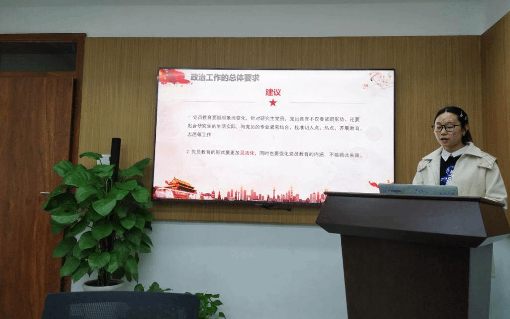 研究生第五党支部于3月23日晚在工科楼225室开展三月主题党日活动及预备党员转正大会和党员民主评议活动,党支部副书记杨金艳主持本次活动。