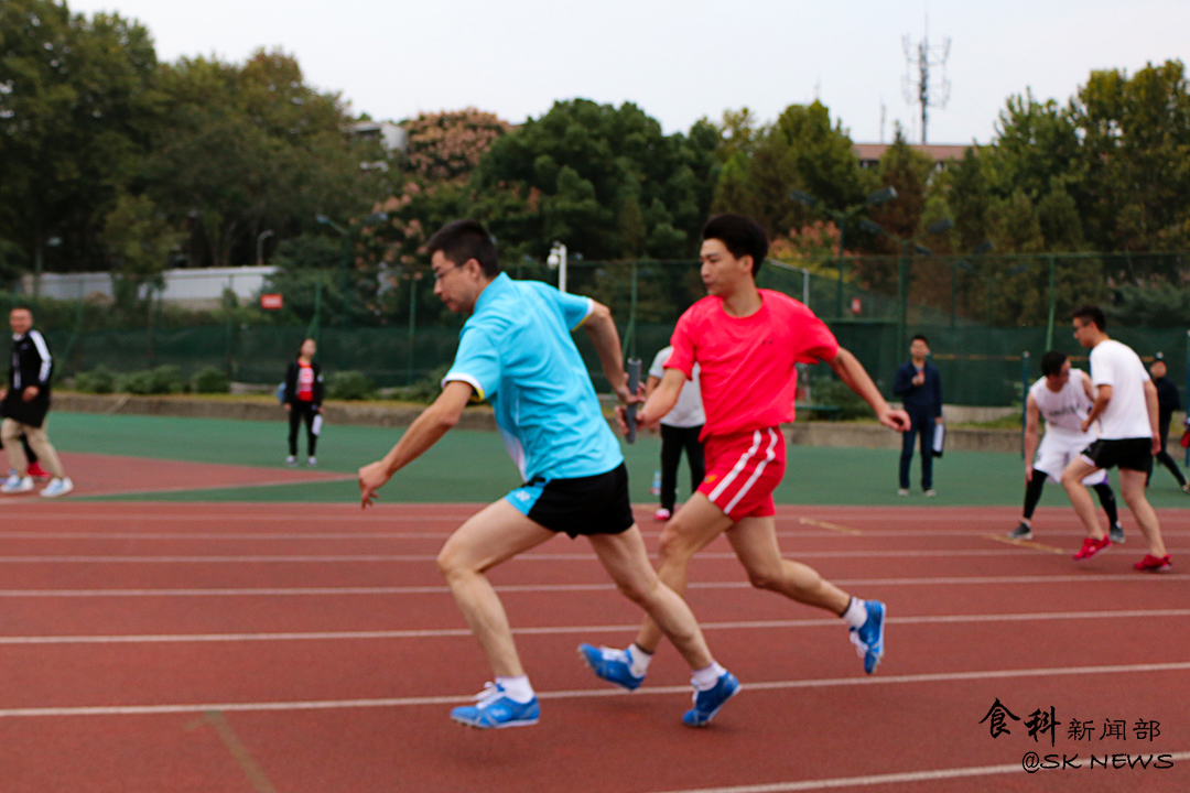 作为学生辅导员的刘超今年已经是第三年参加4*100m男子接力赛,同时,他也是此次男子接力赛决赛的第一棒,张卓和侯涛分别作为第二棒与第三棒,向异之作为此次接力赛的最后一棒。由于食科处于内道,起跑位点相对靠后,信号枪打响后,刘超奋力向前,距离瞬间被拉平,并隐隐有了超越之势。而在接力棒的交接方面,四人也配合得十分默契,整个比赛过程进行得相当顺利。
